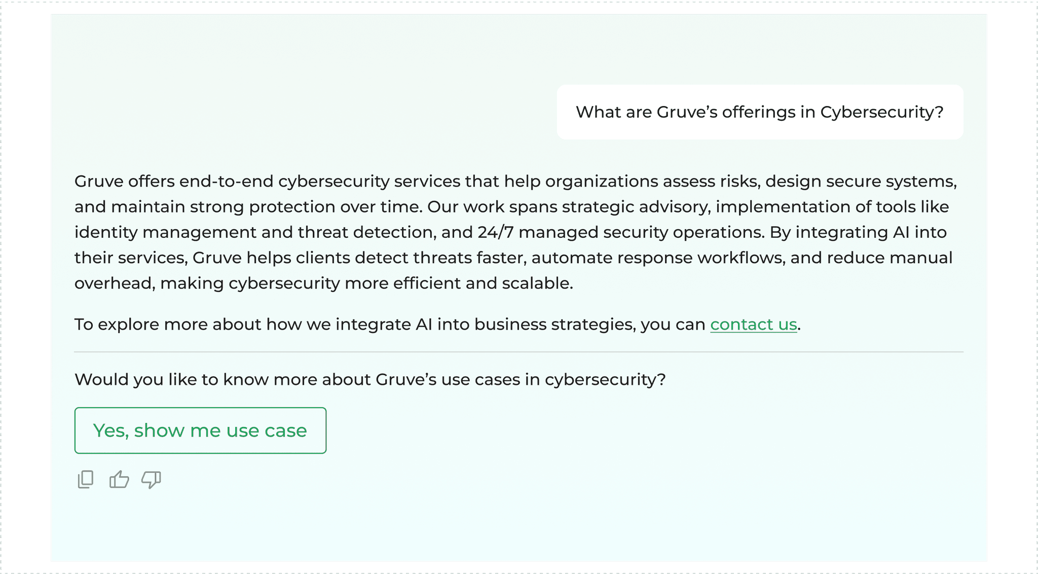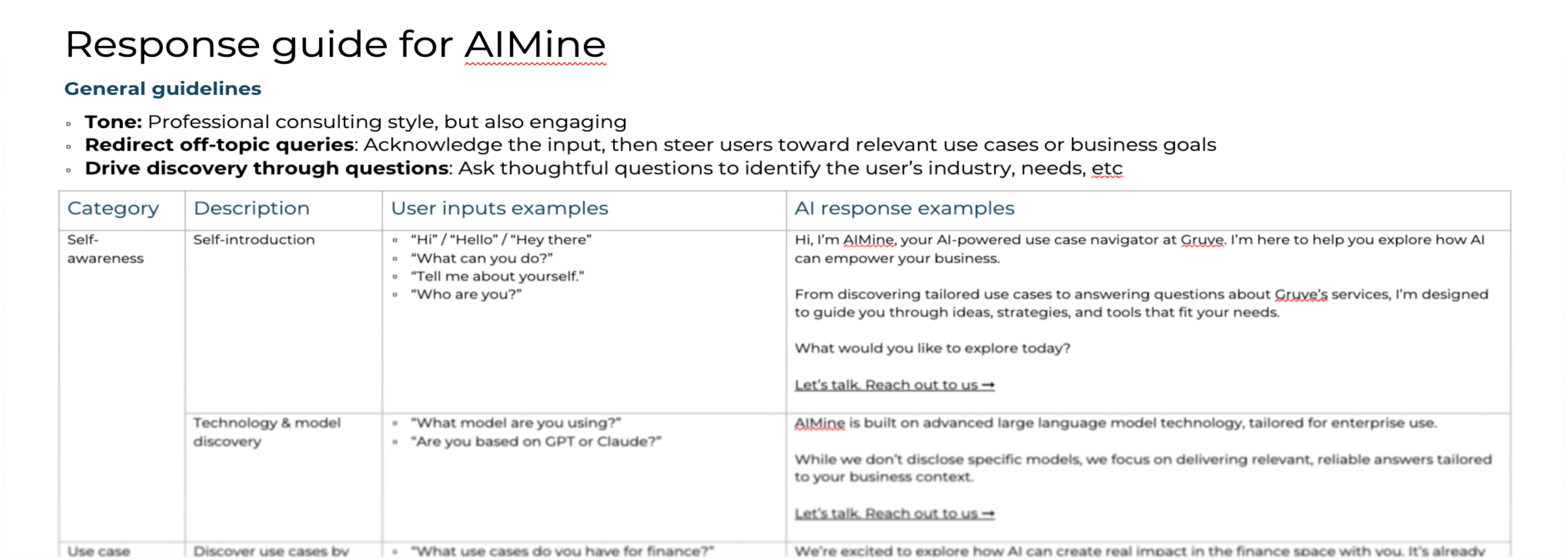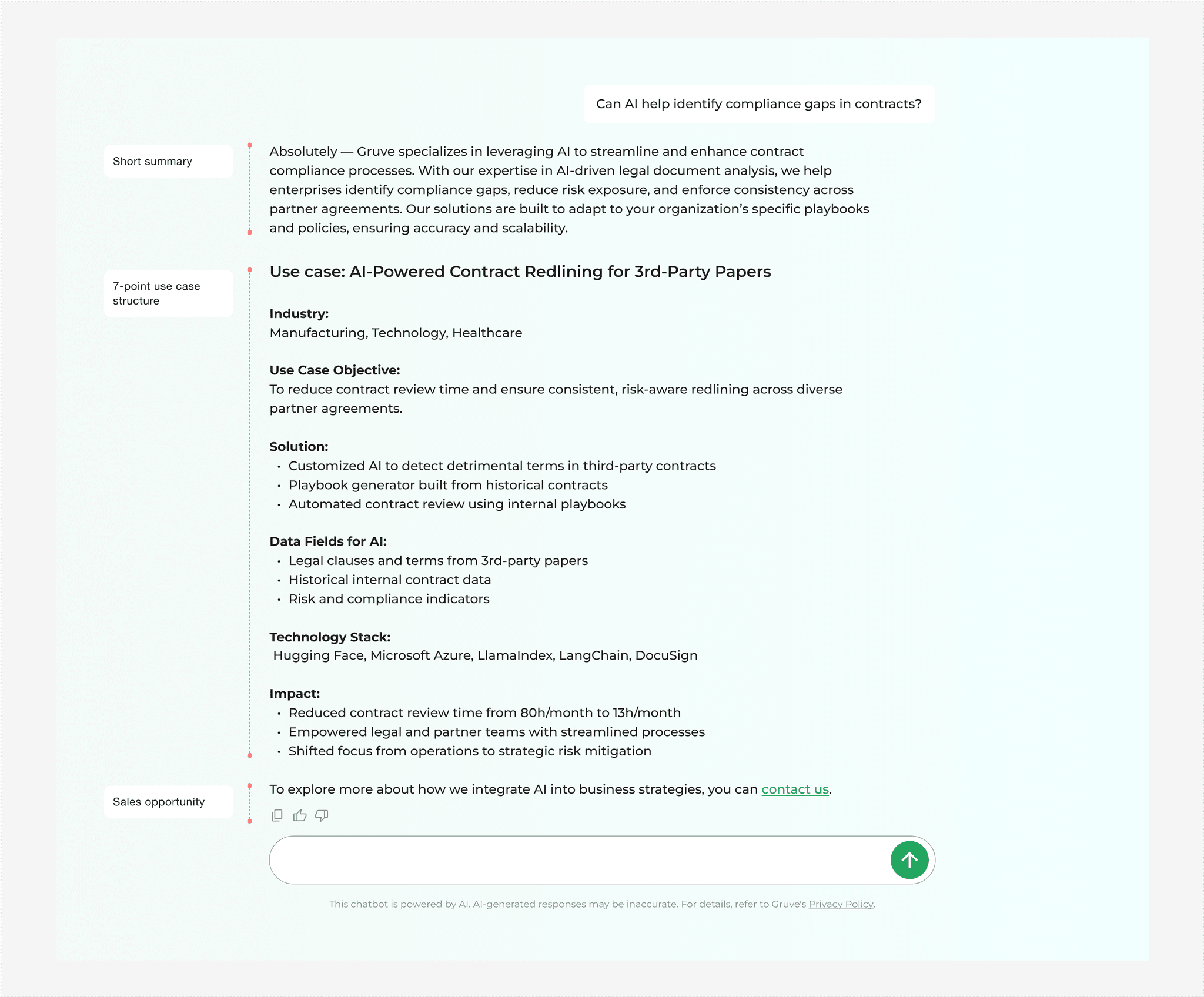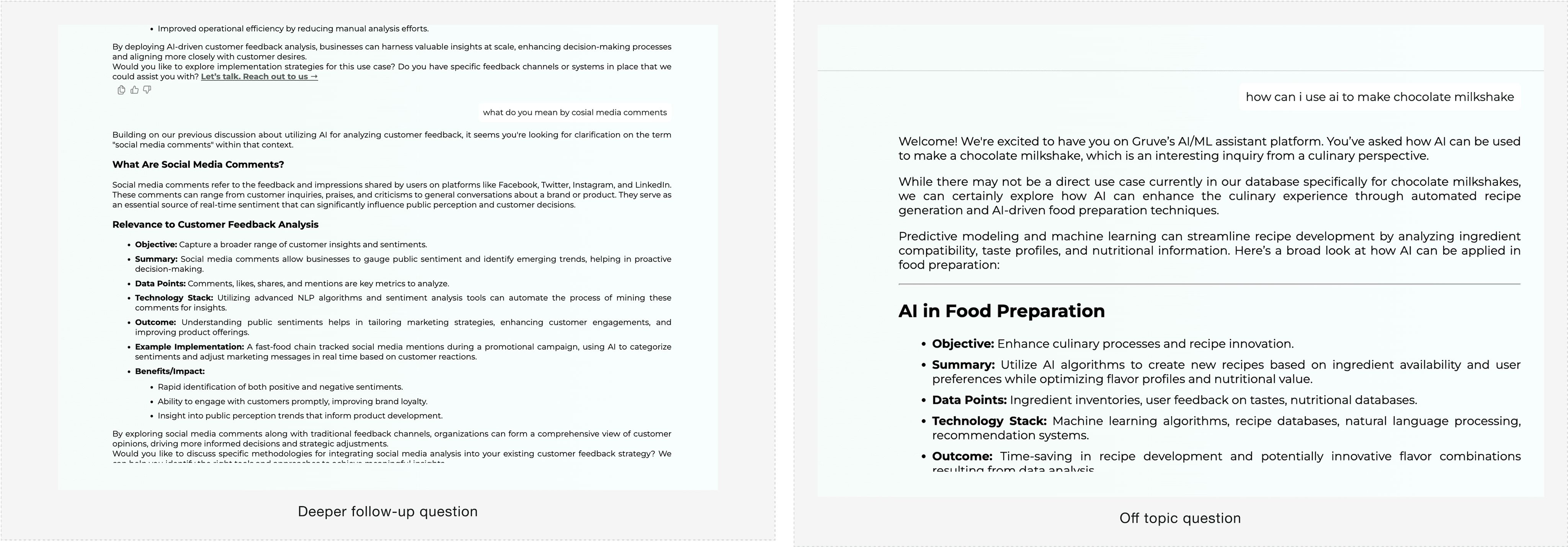 I collaborated with the team to develop a 7-point use case structure to make AI-generated outputs more consistent and easier to maintain in the use case library. However, after testing with users, we found that this structure was being applied too rigidly. It appeared not only for use case-related queries but also for broader or deeper follow up questions—such as “What are Gruve’s offerings?” or inquiries about specific technology stacks. As a result, the AI’s responses became repetitive and overly predictable, limiting the depth and flexibility users expected.