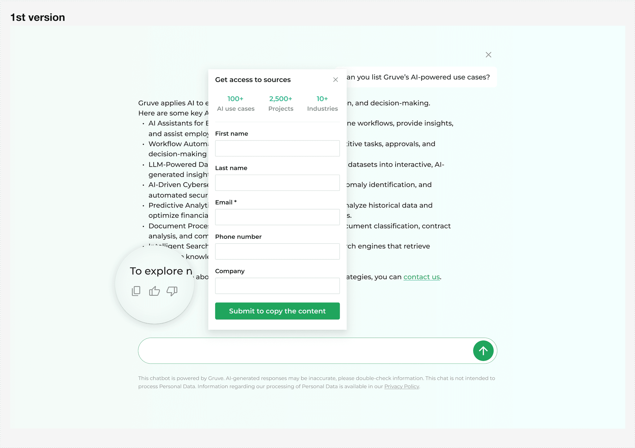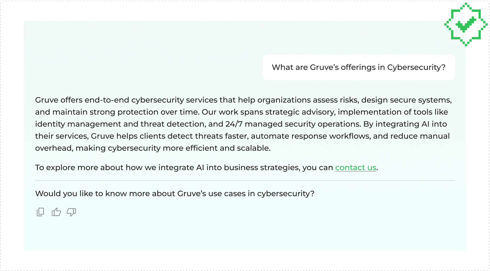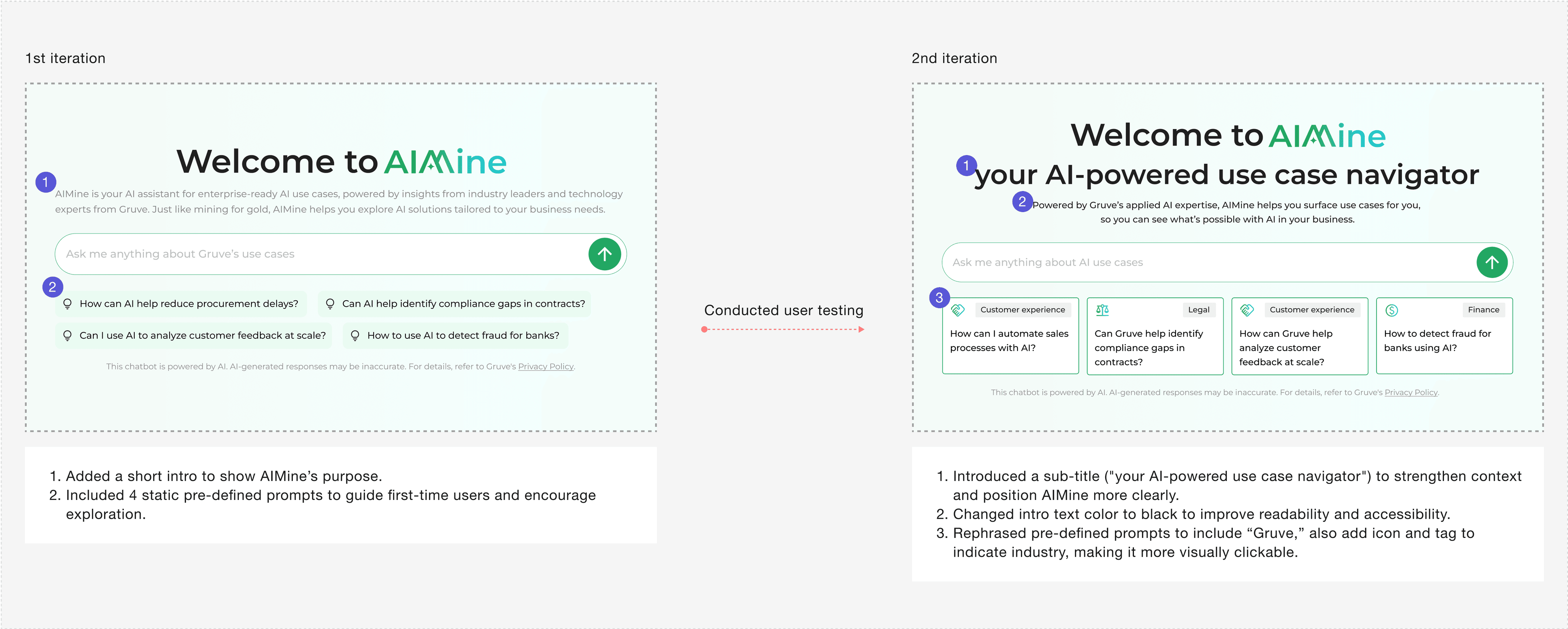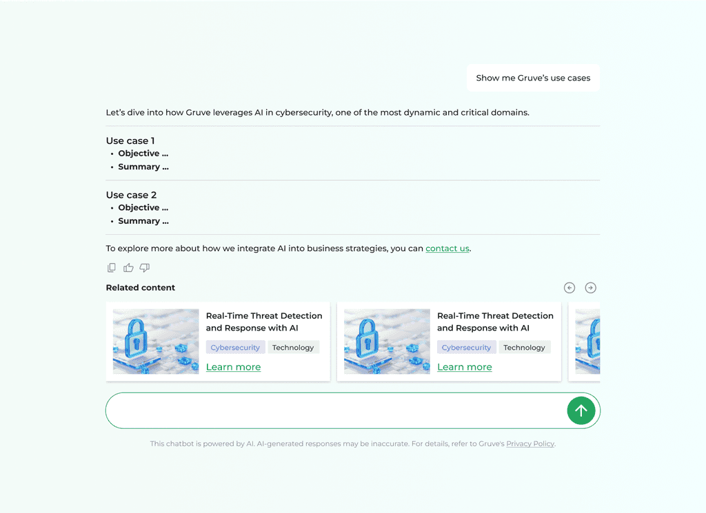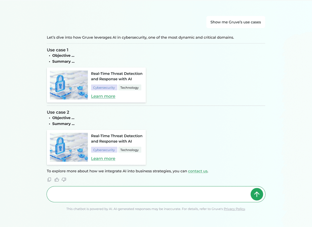 I collaborated with the team to develop a 7-point use case structure to make AI-generated outputs more consistent and easier to maintain in the use case library. However, after testing with users, we found that this structure was being applied too rigidly. It appeared not only for use case-related queries but also for broader or deeper follow up questions—such as “What are Gruve’s offerings?” or inquiries about specific technology stacks. As a result, the AI’s responses became repetitive and overly predictable, limiting the depth and flexibility users expected.