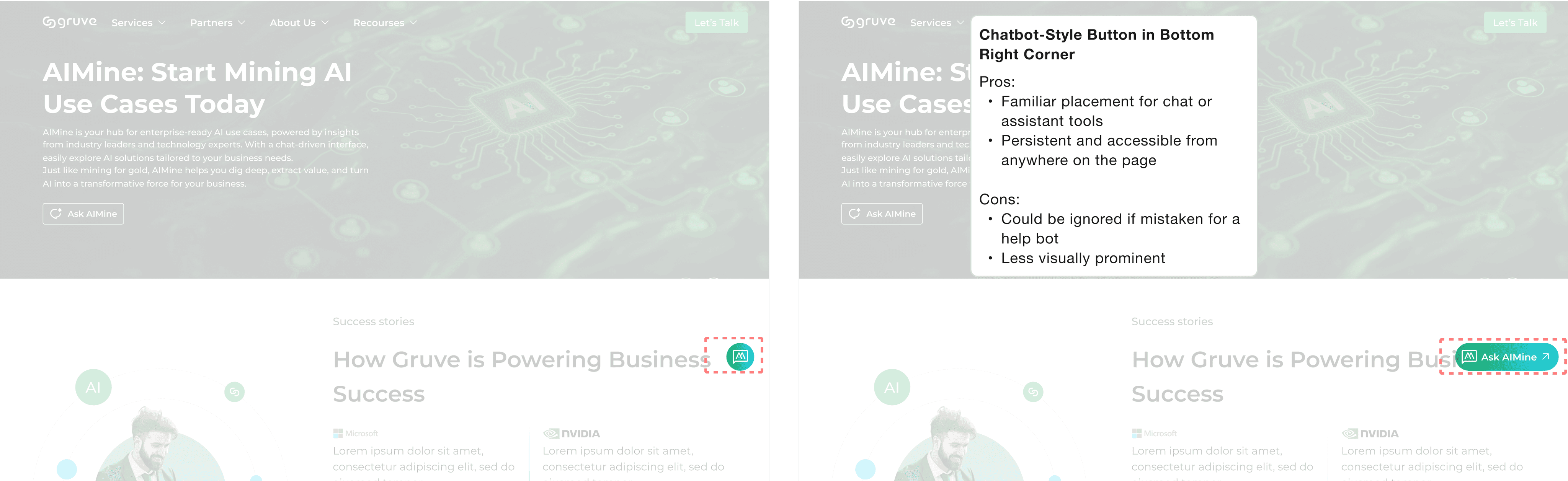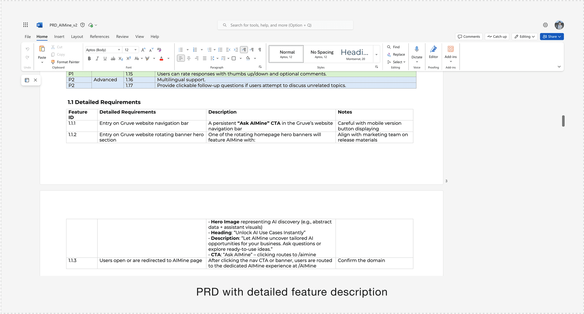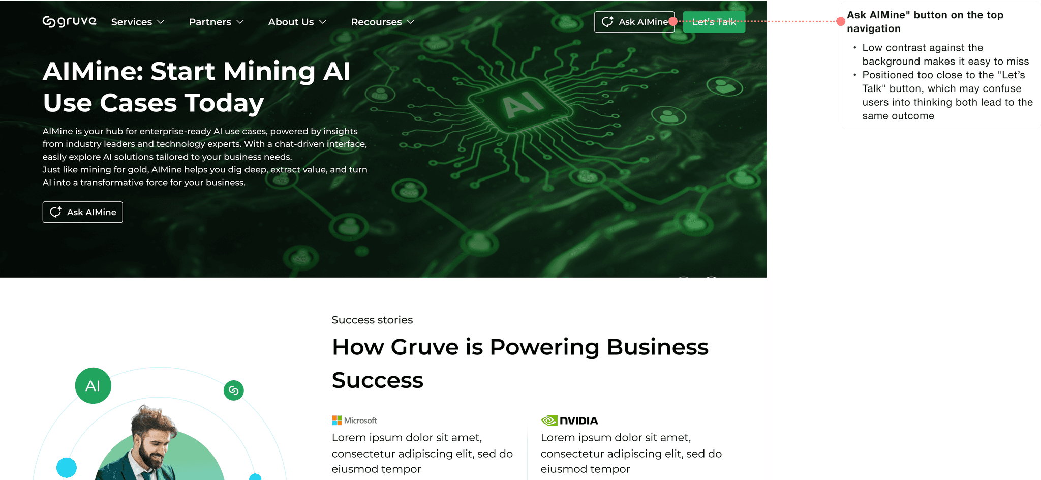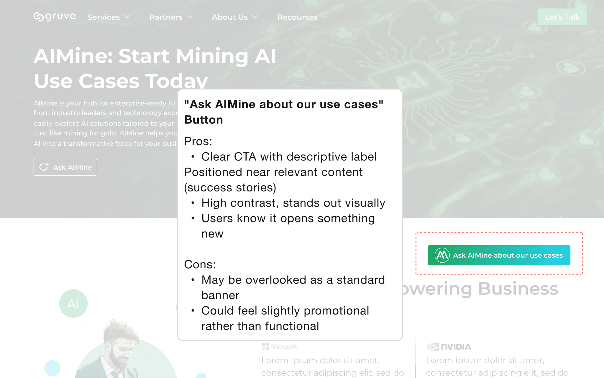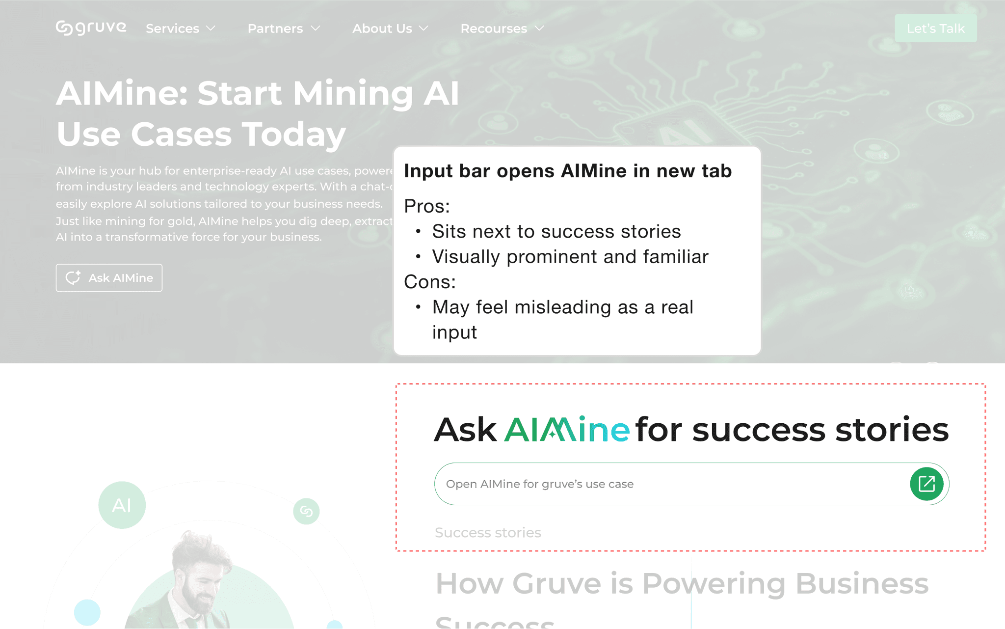 “Create an internal customer-facing platform, AIMine, to showcase curated, enterprise-ready AI use cases through a chat-based interface. The experience should align with Gruve’s “Mining” concept and support sales by making AI services easily discoverable. It’s set to launch soon and draws inspiration from competitors like Globant and IBM.”