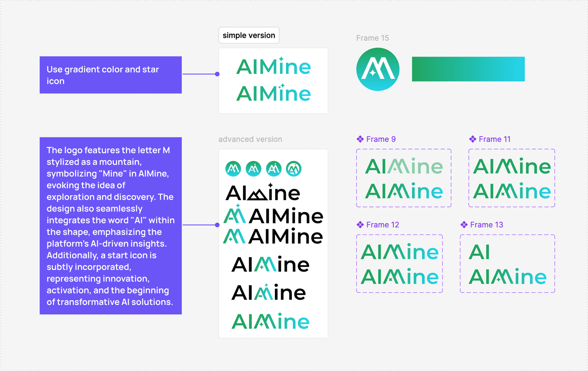I designed AIMine’s logo using a mountain-shaped “M” to symbolize mining, with a star icon and gradient to represent AI and innovation.